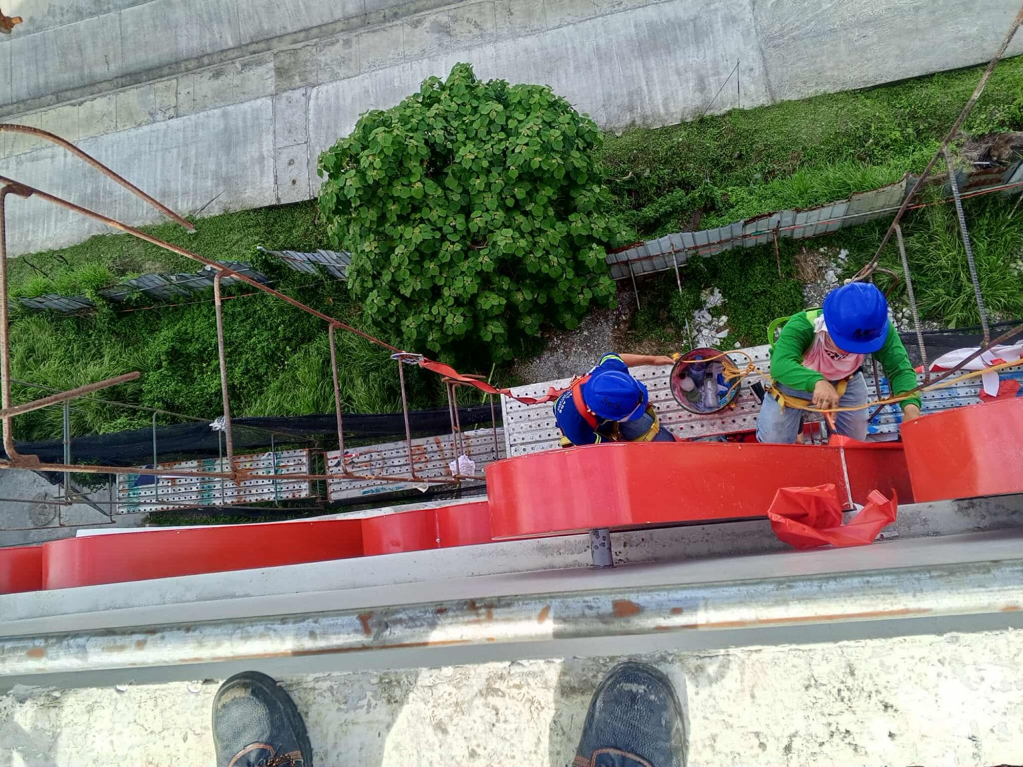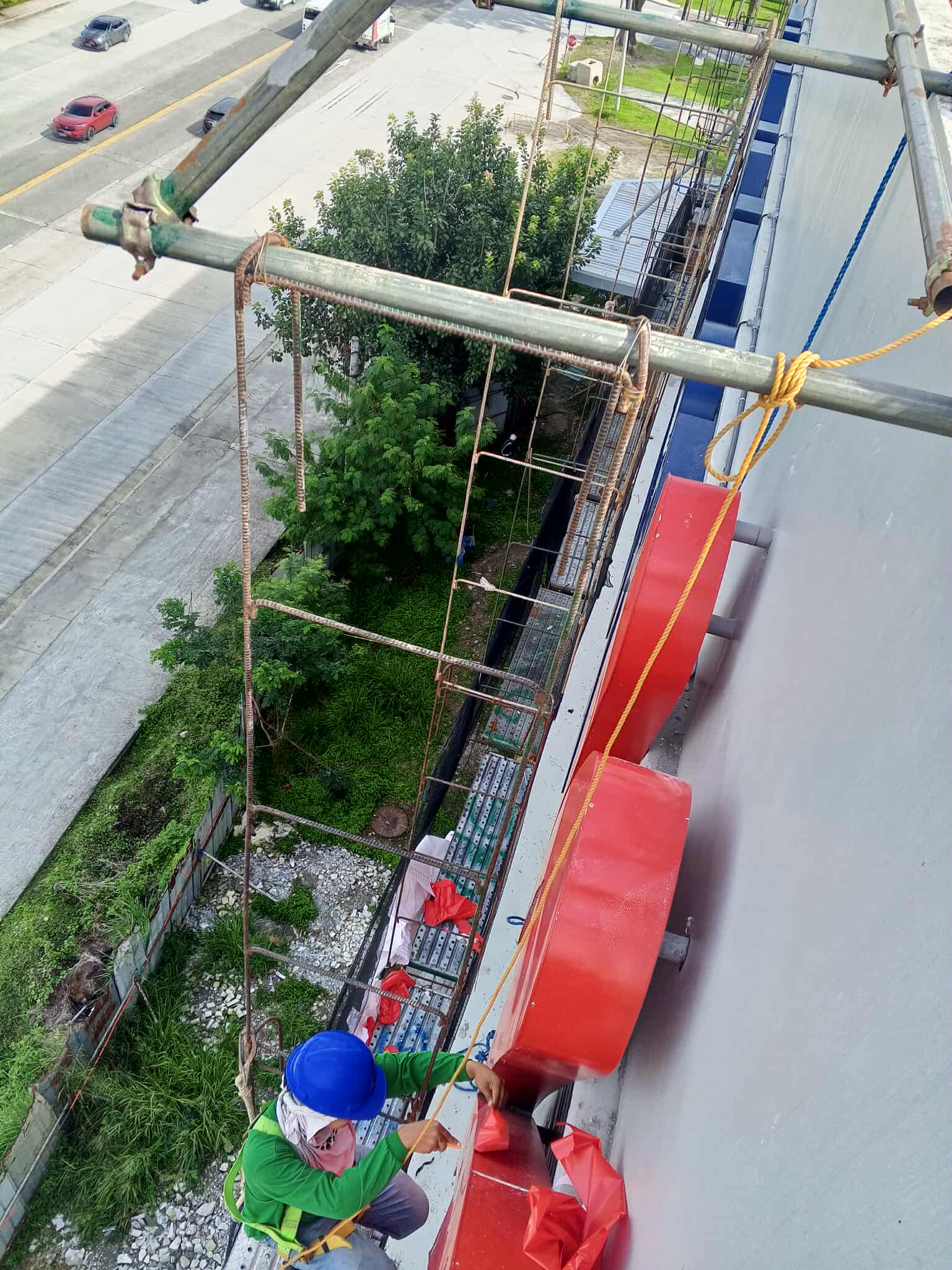 Outdoor building banner signage installation by construction workers in Metro Manila, sign maker Philippines by M&G Global Ads.Two workers install outdoor billboard signage on a building in Metro Manila—sign maker Philippines by M&G Global Ads.