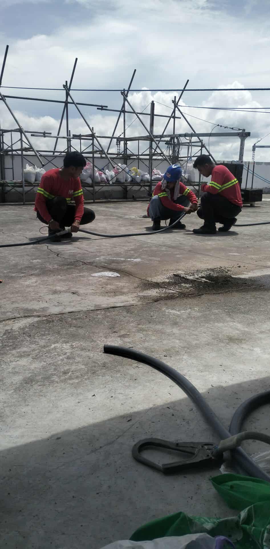 Technical diagram of workers installing safety equipment on a rooftop for building signage, Metro Manila, sign maker Philippines by M&G Global Ads.Digital rendering of workers installing outdoor acrylic building signage, Metro Manila, sign maker Philippines by M&G Global Ads.