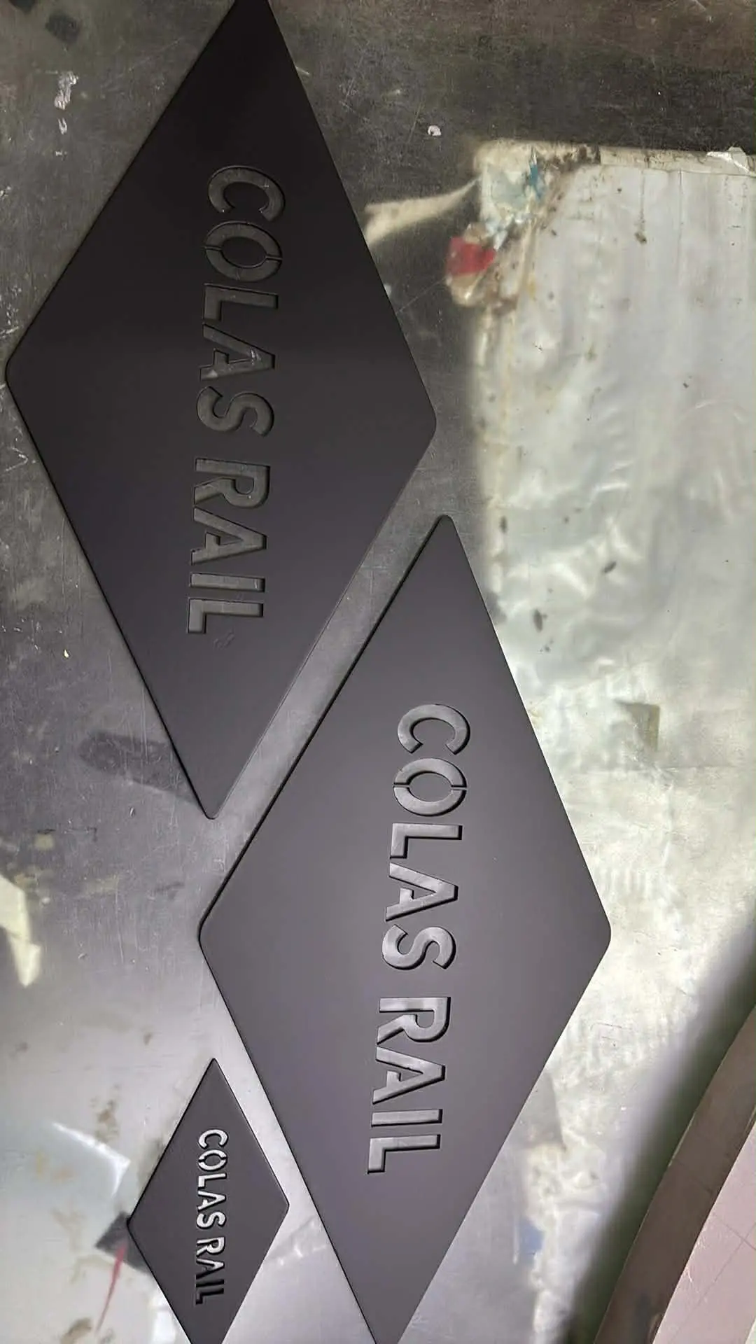 Stainless steel building signage for COLAS RAIL, diamond-shaped plaques, Metro Manila sign maker Philippines by M&G Global Ads.