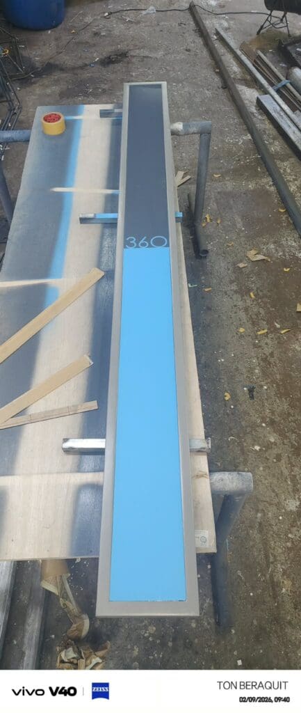 Acrylic wayfinding sign with blue strip and white 360, workshop setting, Metro Manila, sign maker Philippines by M&G Global Ads.