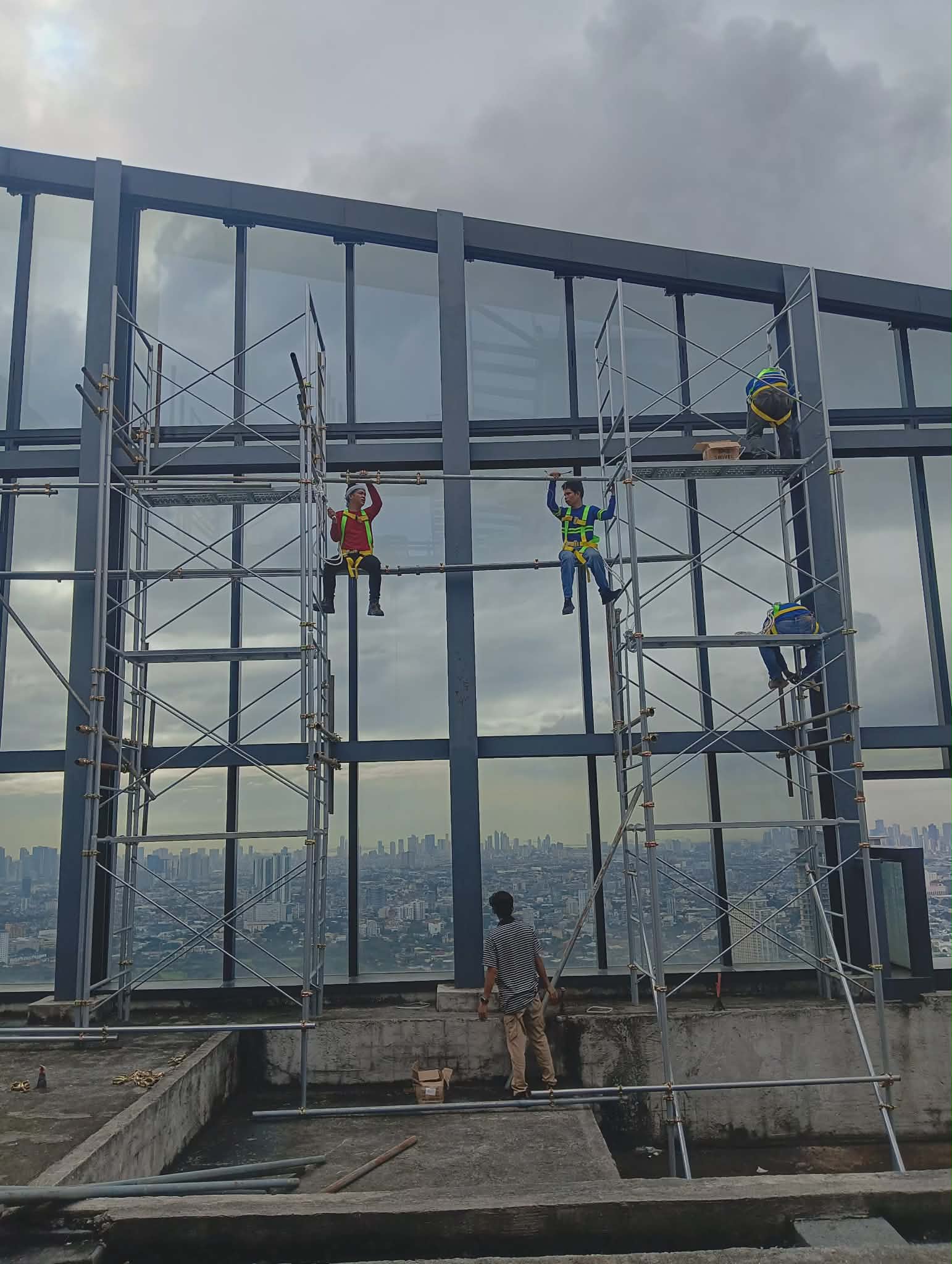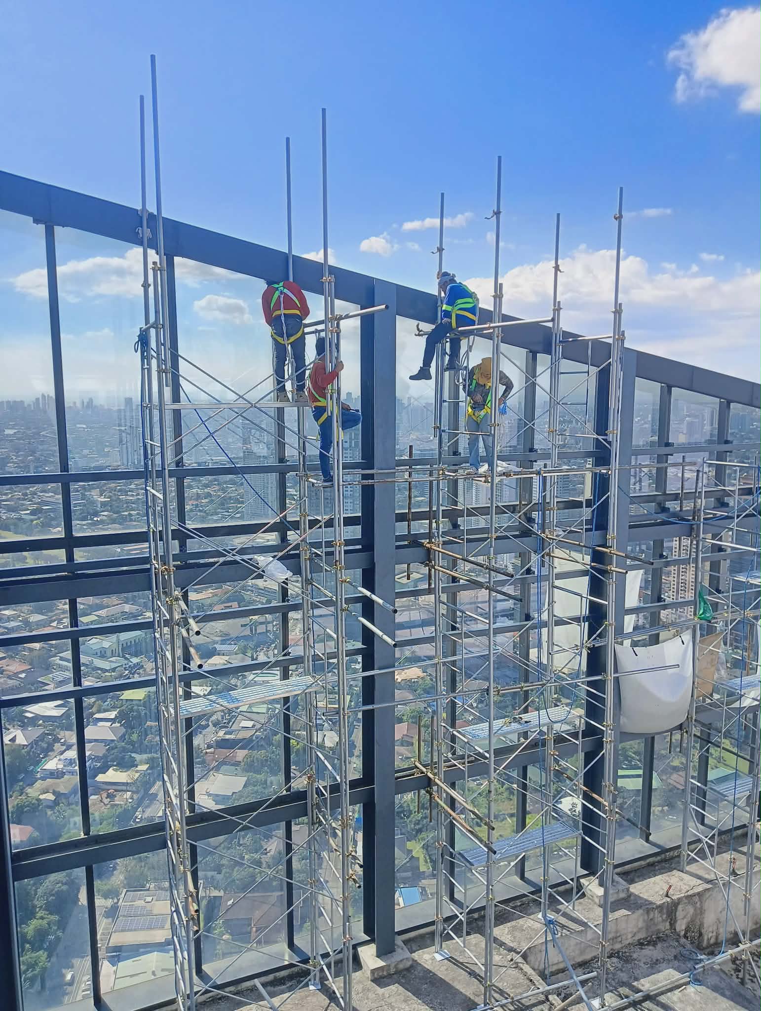 Three workers on scaffolding installing outdoor building signage, high-rise, city view, Metro Manila sign maker Philippines by M&G Global Ads.