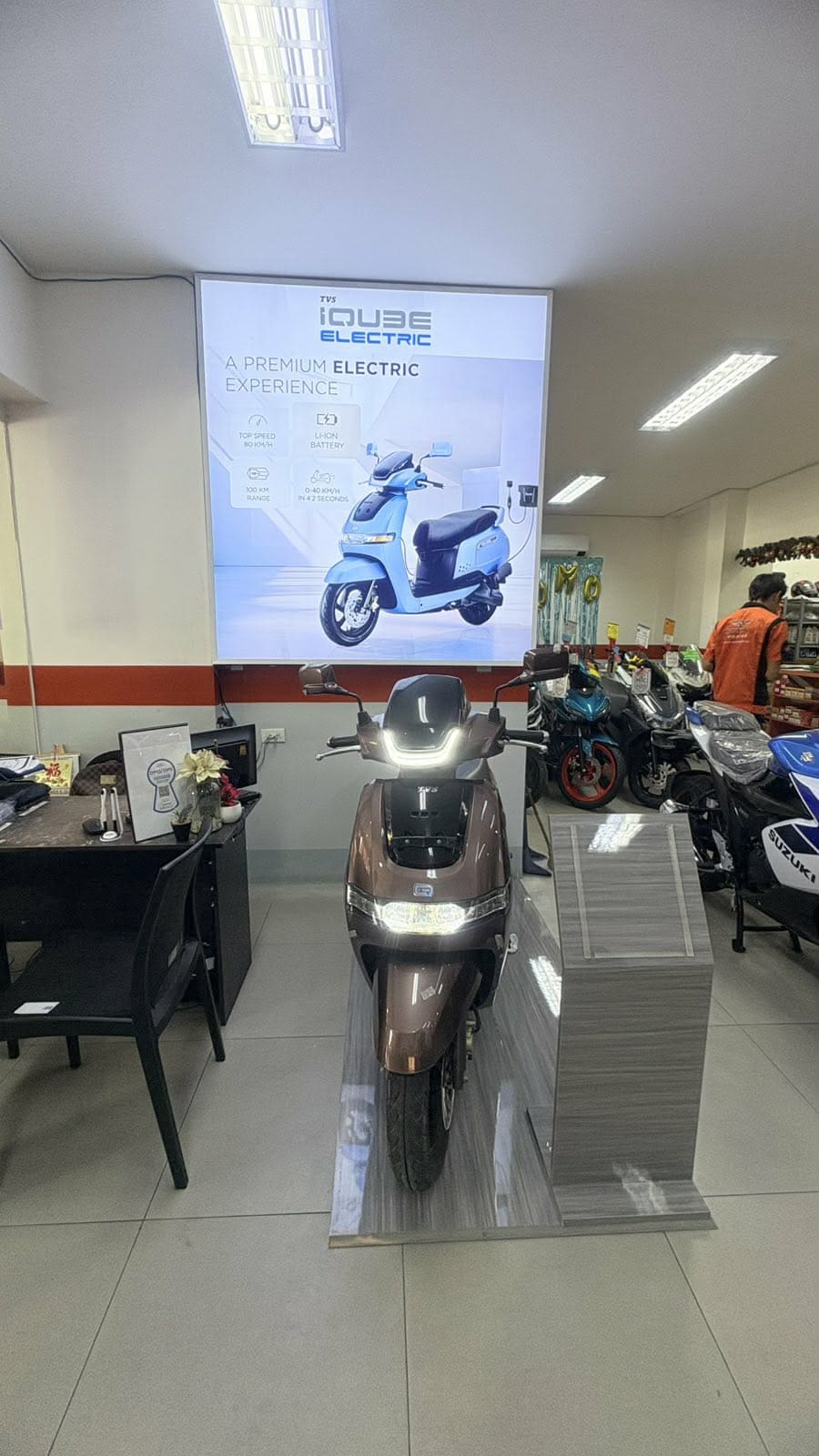 Electric scooter in showroom with acrylic promotional signage, office desks, and motorbikes. Sign maker Philippines by M&G Global Ads.