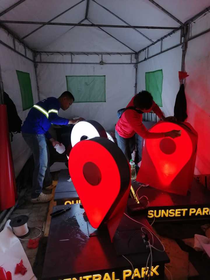 Two people assembling large LED acrylic map pin wayfinding signage for Sunset Park and Central Park in the Philippines, sign maker Philippines by M&G Global Ads.