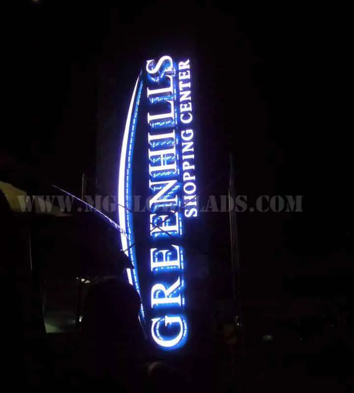 Illuminated pylon signage for Greenhills Shopping Center at night in San Juan with blue and white letters by M&G Global Ads.