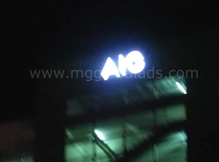 AIG LED building signage in Makati at night, glowing with faint structural details, watermark visible—by M&G Global Ads.