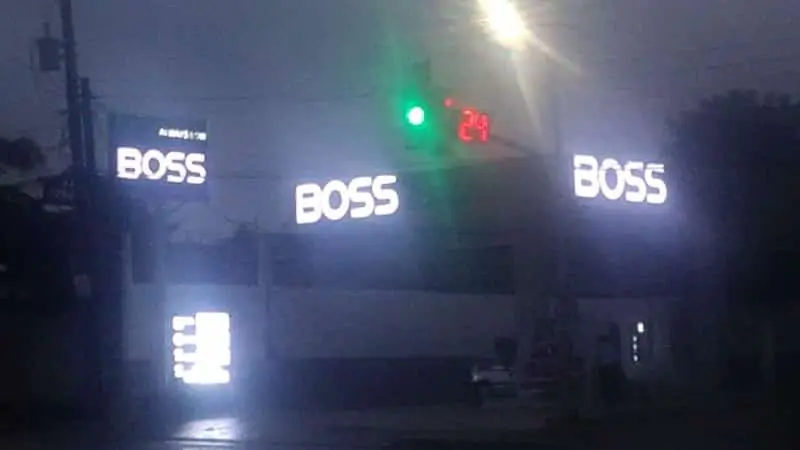 Illuminated BOSS building signage and green traffic light at night in Makati. LED signs for BOSS by M&G Global Ads.