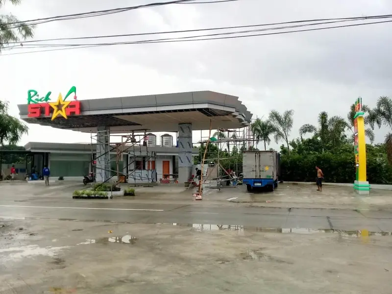 Canopy signage construction at a gas station in Quezon City with scaffolding, delivery truck, and palm trees by M&G Global Ads.