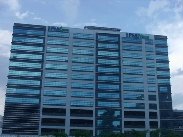 Infi building with white rooftop signage, glass facade, trees below, cloudy sky in Makati by M&G Global Ads.