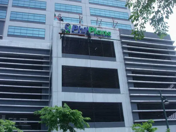 PhilPlans building signage installation on office exterior in Makati, worker on suspended platform by M&G Global Ads.