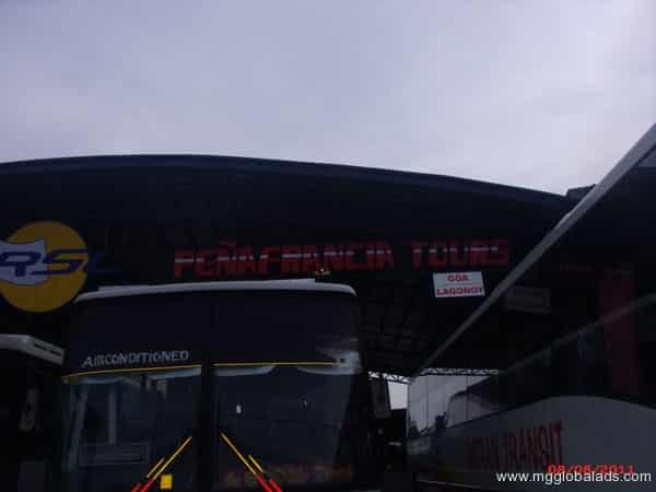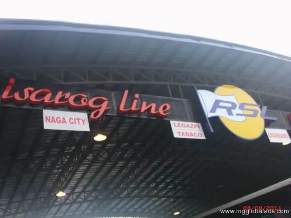 Isarog Line RSL bus terminal signage in Quezon City with destinations Naga, Legazpi, Tabaco, date and website by M&G Global Ads.
