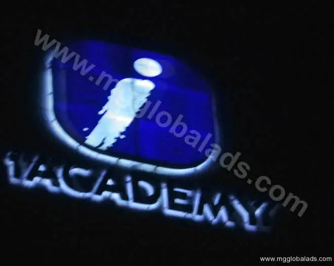 Illuminated academy signage with logo for educational institution in Makati. www.mgglobalads.com watermark. By M&G Global Ads.