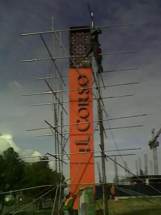Pylon signage for IL CORSO surrounded by scaffolding in Mandaluyong, with construction workers and cranes, by M&G Global Ads.