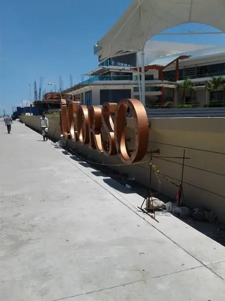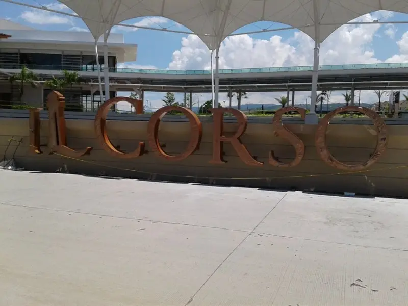 Outdoor metallic letter signage for IL CORSO at a modern building, palm trees, and canopy in Mandaluyong by M&G Global Ads.