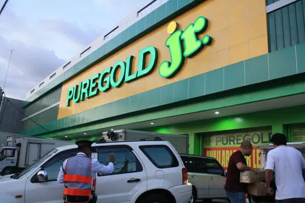 Puregold Jr. LED store signage in Quezon City, with security guard and white SUV at entrance, by M&G Global Ads.