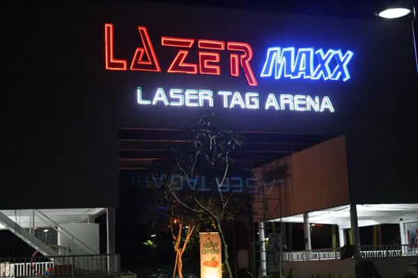 LAZER MAXX LASER TAG ARENA neon signage at night on building facade in Quezon City, by M&G Global Ads.