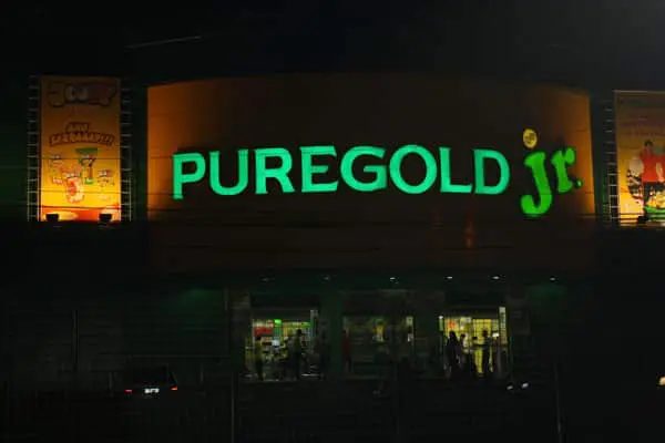 Illuminated PUREGOLD jr. frontlit signage at a supermarket in Ortigas at night, people inside. By M&G Global Ads.