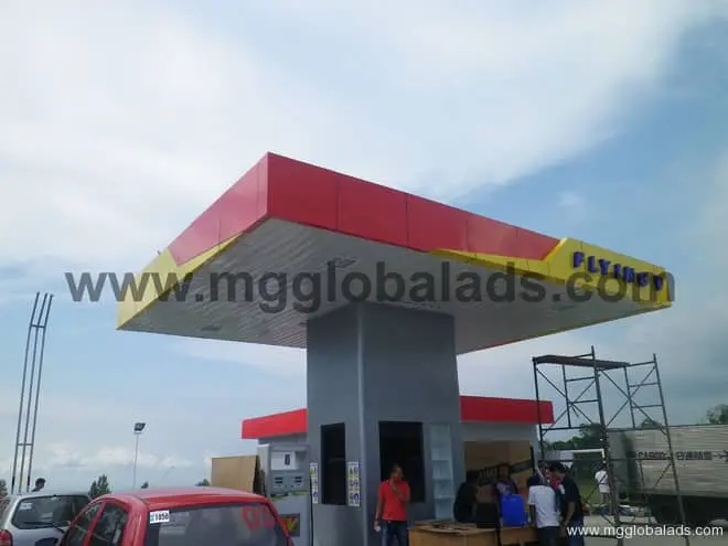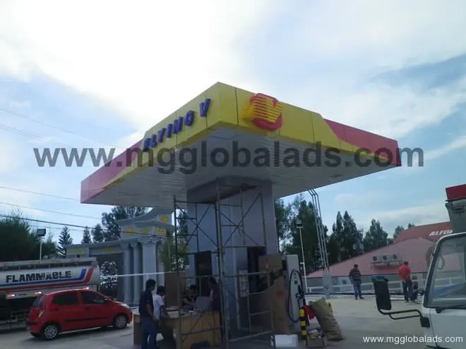 Gas station canopy signage construction with scaffolding, workers, red car in Quezon City, yellow and red scheme by M&G Global Ads.
