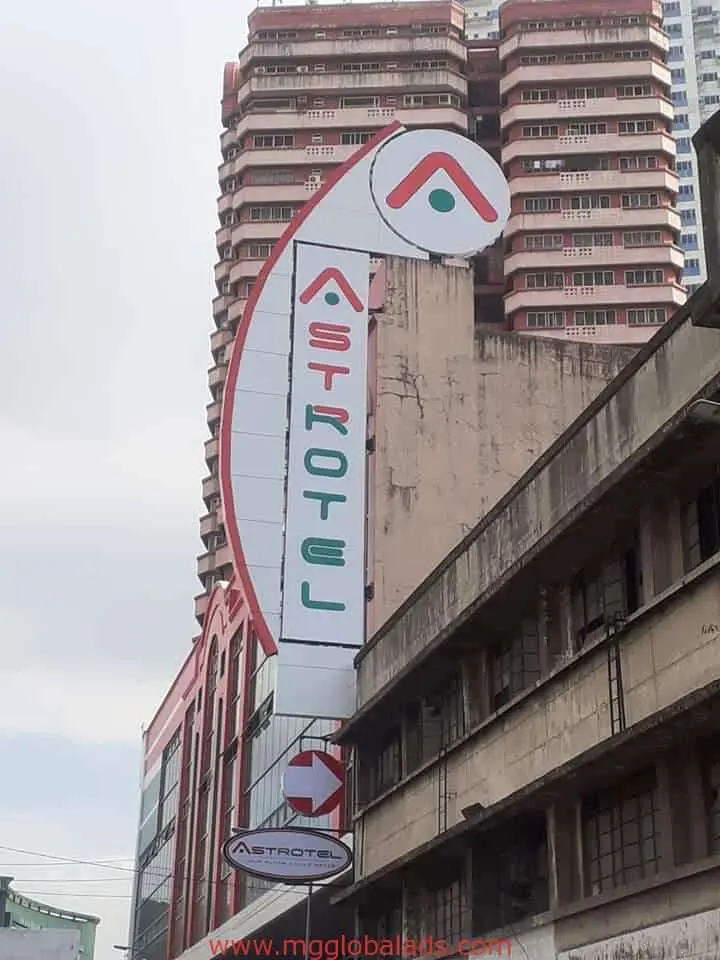 Astrotel hotel signage, vertical style with red, green, white arrows in Makati skyline by M&G Global Ads.