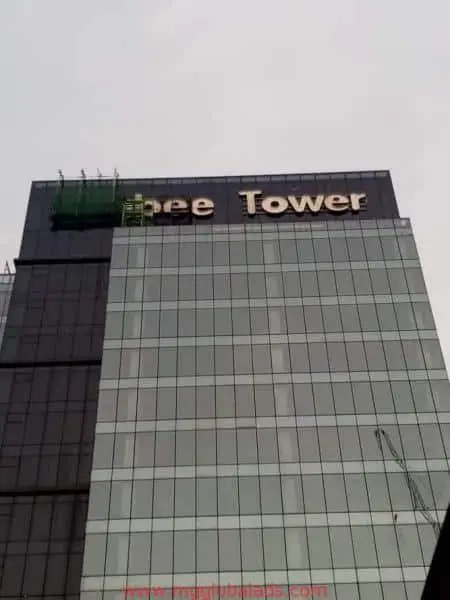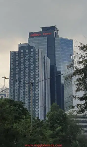 Jollibee Tower building signage for Jollibee on a tall glass skyscraper in Ortigas, under cloudy sky, by M&G Global Ads.