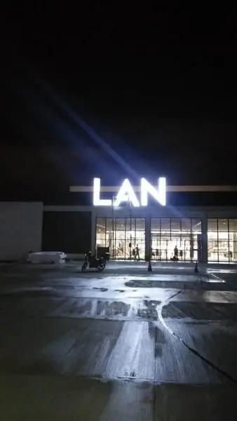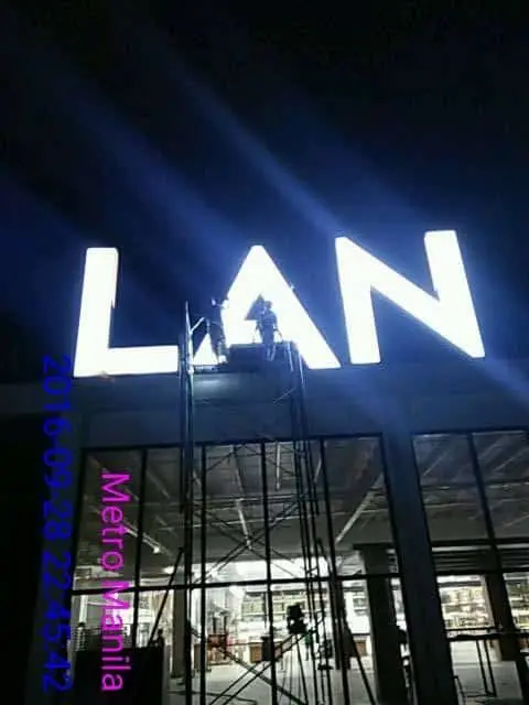 Illuminated channel letter signage LAN at night above a building entrance in Makati, wet ground, motorcycle in front by M&G Global Ads.