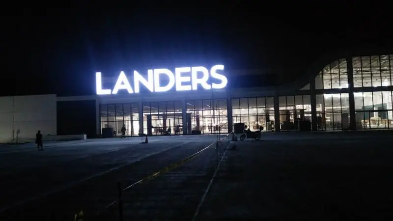 Illuminated LANDERS storefront signage with glass facade and empty parking lot at night in Quezon City by M&G Global Ads.