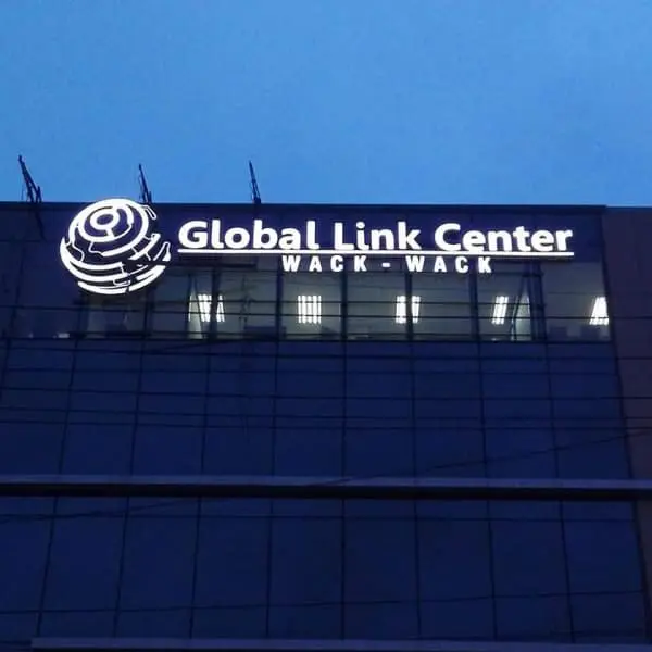 LED illuminated building signage for Global Link Center Wack Wack, Mandaluyong facade at dusk by M&G Global Ads.