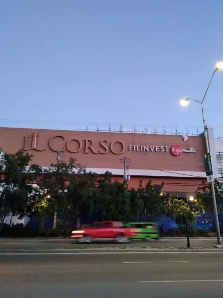 Outdoor building signage for IL CORSO FILINVEST Lifemalls in Quezon City, street traffic at dusk, by M&G Global Ads.