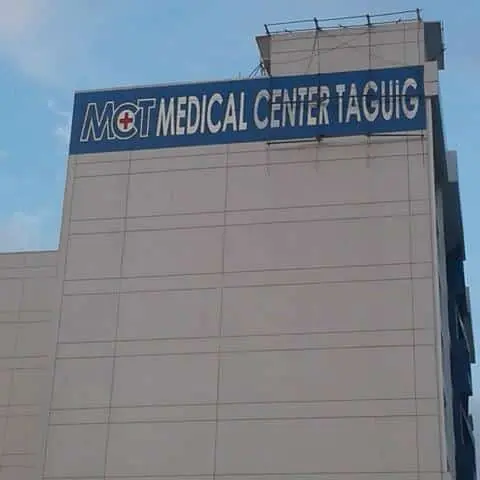 Hospital building with illuminated signage for MCT Medical Center Taguig, red cross symbol, in Makati. By M&G Global Ads.