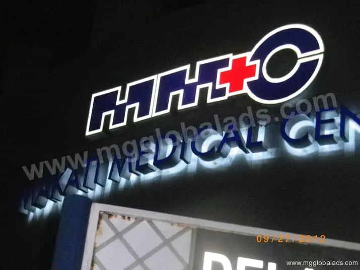 Illuminated hospital signage for MAKATI MEDICAL CENTER in Ortigas with red cross, logo. By M&G Global Ads.