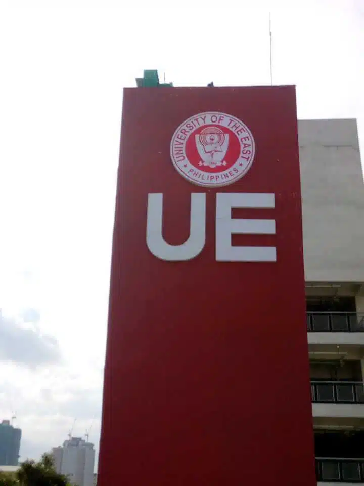 University of the East building facade with UE channel letter signage and logo in Quezon City by M&G Global Ads.