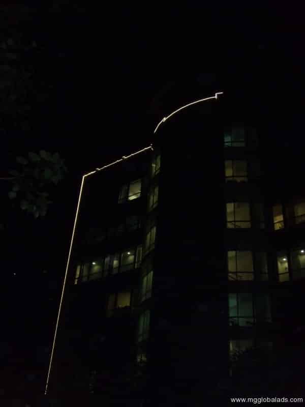 Curved yellow LED roof signage on a dimly lit building in Ortigas at night, installed by M&G Global Ads.
