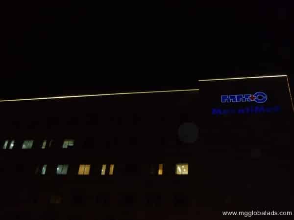 Excelsior Hotel building with illuminated signage and circular logo in Ortigas, Metro Manila. Power lines visible. By M&G Global Ads.