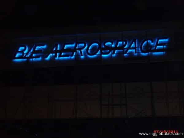 Neon blue B/E AEROSPACE signage at night in Ortigas, Metro Manila, glowing brightly by M&G Global Ads.