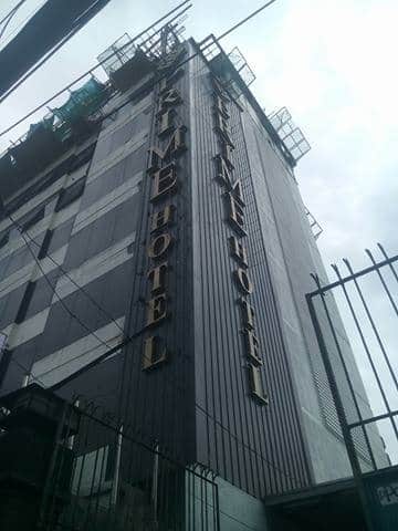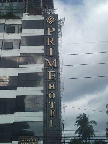 Hotel building signage for PRIME HOTEL in Quezon City, viewed from below on a cloudy day, by M&G Global Ads.