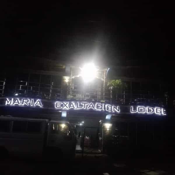 LED signage for MARIA EXALTACION LODEL on a building at night in Quezon City, vehicle parked in front, by M&G Global Ads.
