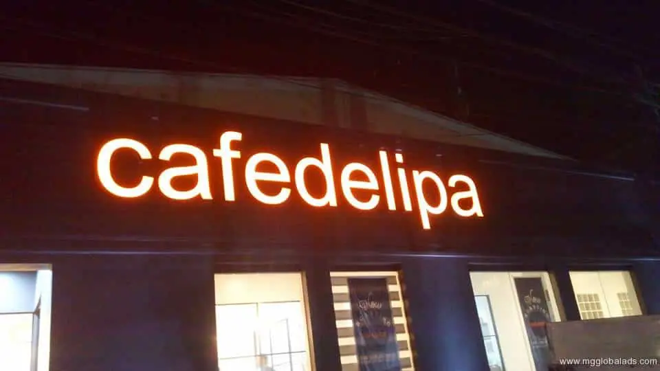 Illuminated channel letter sign for cafedelipa, glowing orange at night in Makati, exterior building signage by M&G Global Ads.