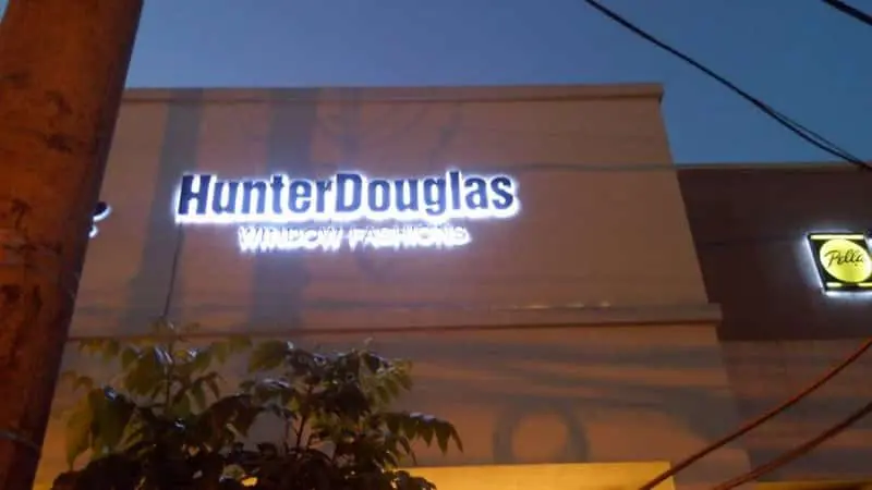 Illuminated Hunter Douglas WINDOW FASHIONS lighted signage on building at dusk in Makati, tree branches in front, by M&G Global Ads.