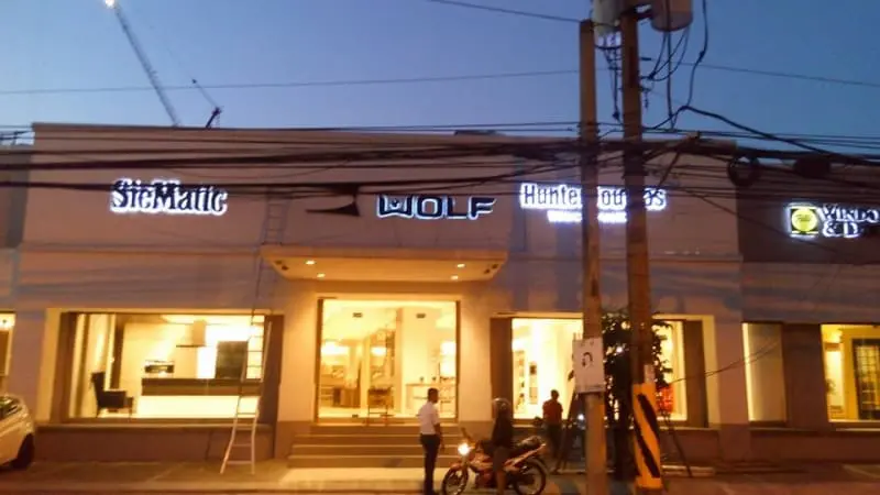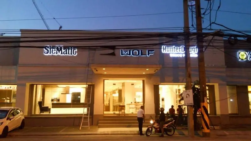 LED backlit signage for SieMatic, WOLF, HunterDouglas in Makati, storefront at dusk with people and motorcycle by M&G Global Ads.