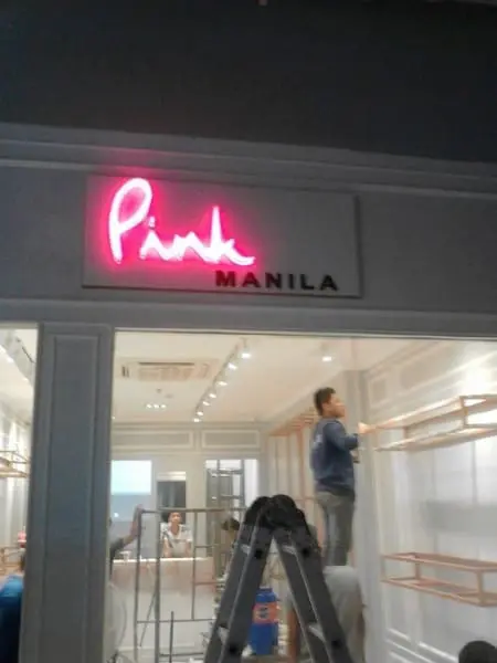 LED neon signage installation for Pink MANILA store in Makati, with workers installing fixtures. Sign by M&G Global Ads.