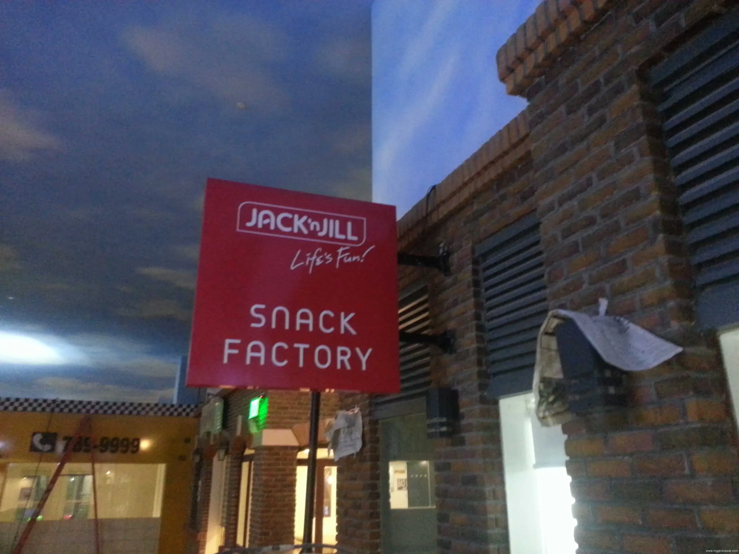 Jack n Jill Snack Factory red outdoor signage on brick building in Makati, blue sky background by M&G Global Ads.