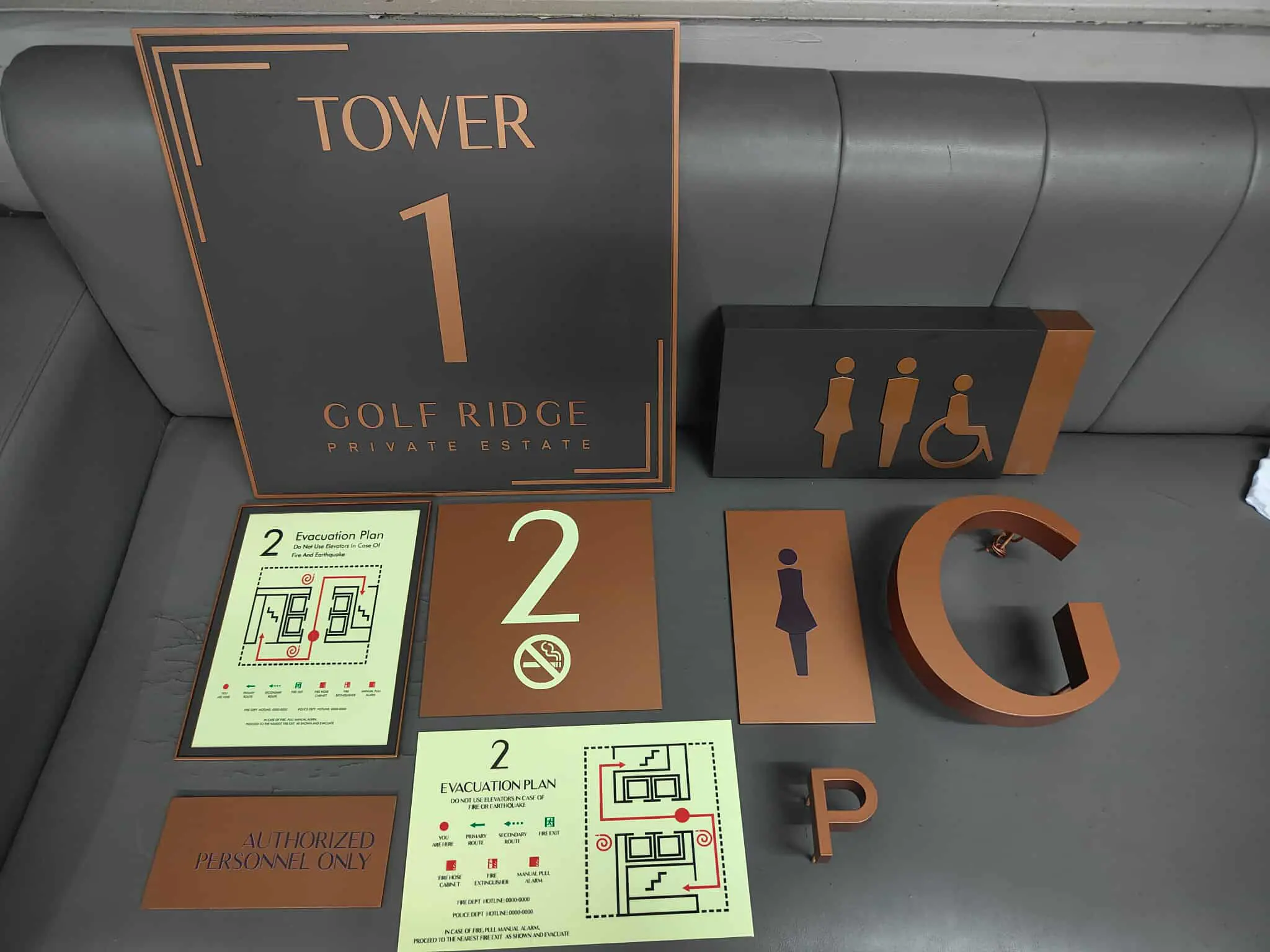 Bronze and black building signage, including restroom, floor numbers, evacuation plans in Mandaluyong by M&G Global Ads.