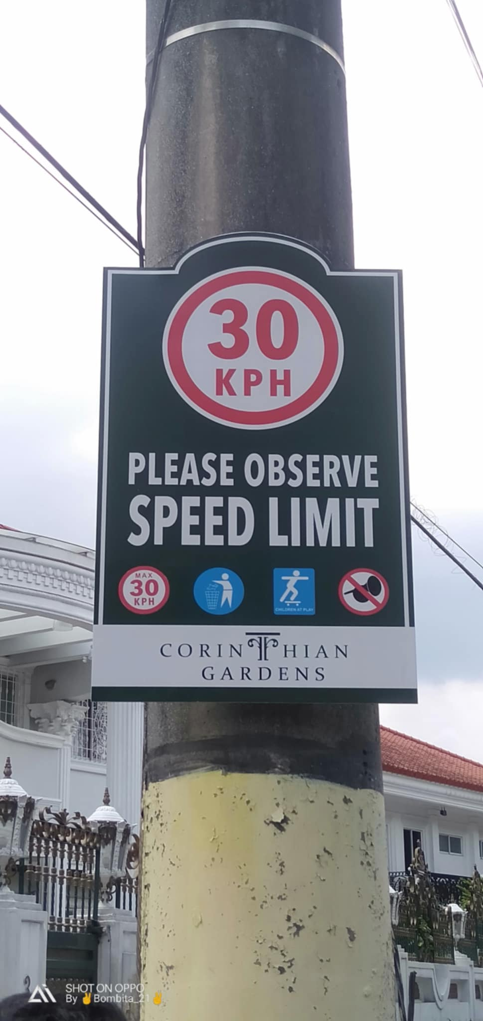 Speed limit street signage for Corinthian Gardens, Quezon City with icons, 30 KPH, CCTV by M&G Global Ads.