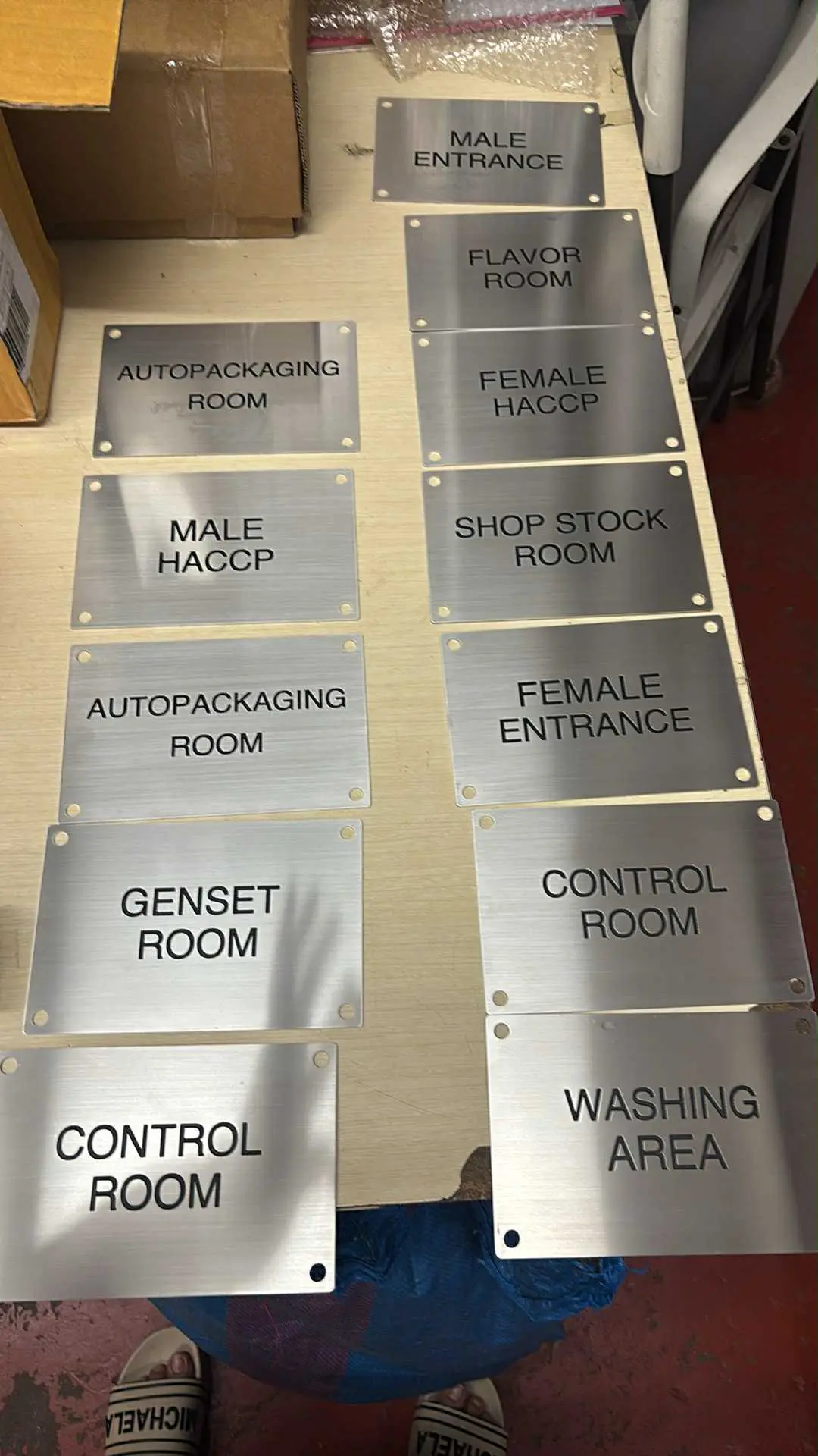Metal door signs CONTROL ROOM, MALE ENTRANCE, etc., displayed on wood in Ortigas by M&G Global Ads. Persons feet partly shown.