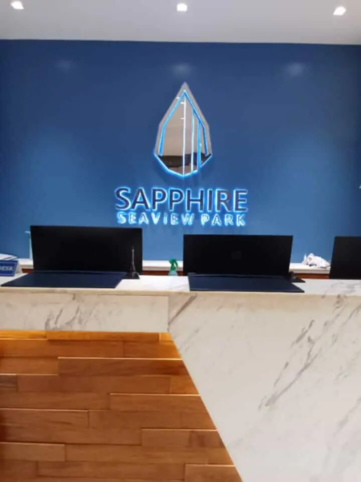 Illuminated signage for Sapphire Seaview Park reception in Makati, with geometric logo by M&G Global Ads.