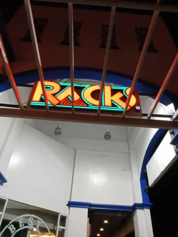 RACKS neon signage above building entrance at night in Pasig, white exterior with blue accents by M&G Global Ads.