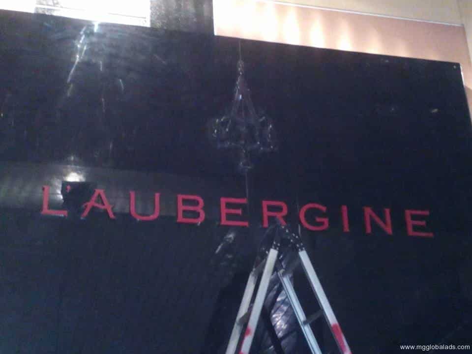 Restaurant wall signage for LAUBERGINE with red letters and ladder in Makati by M&G Global Ads.