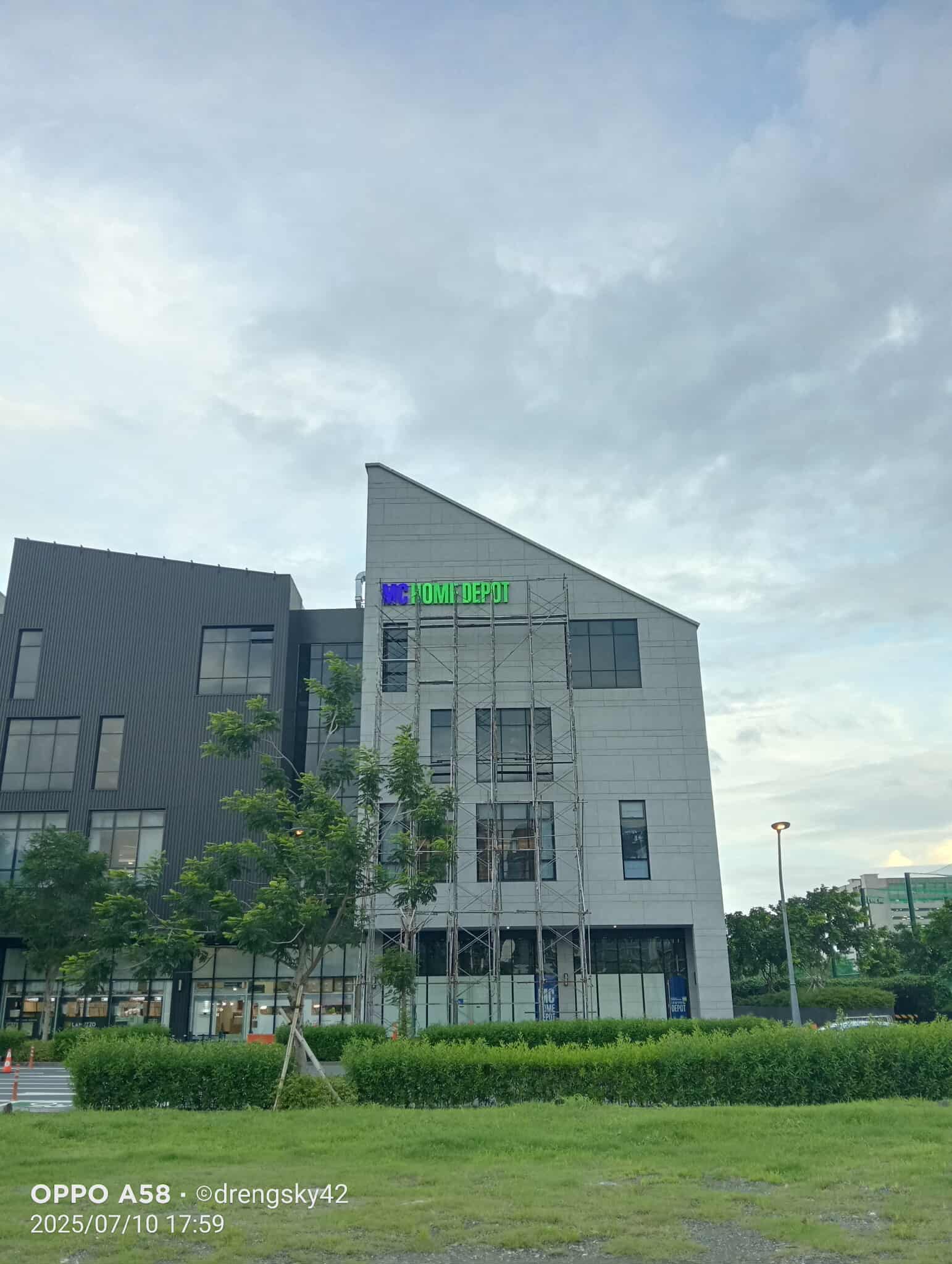 HOM DEPOT green building signage installation on modern building with scaffolding in Quezon City by M&G Global Ads.