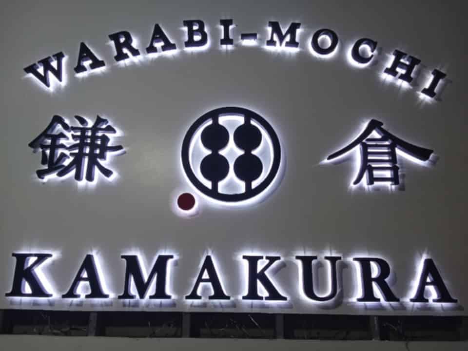 LED signage for WARABI-MOCHI KAMAKURA with Japanese kanji and circular logo on white background by M&G Global Ads.