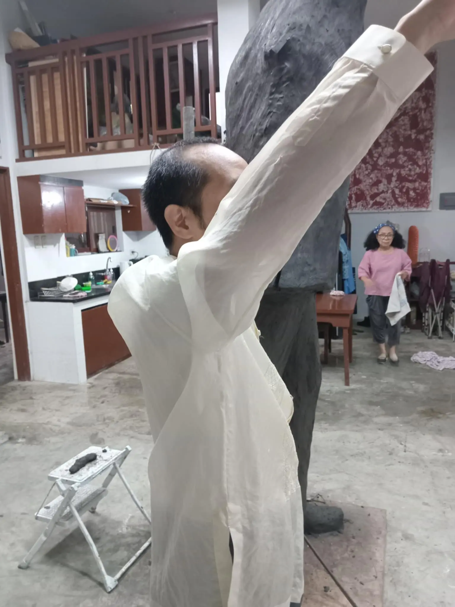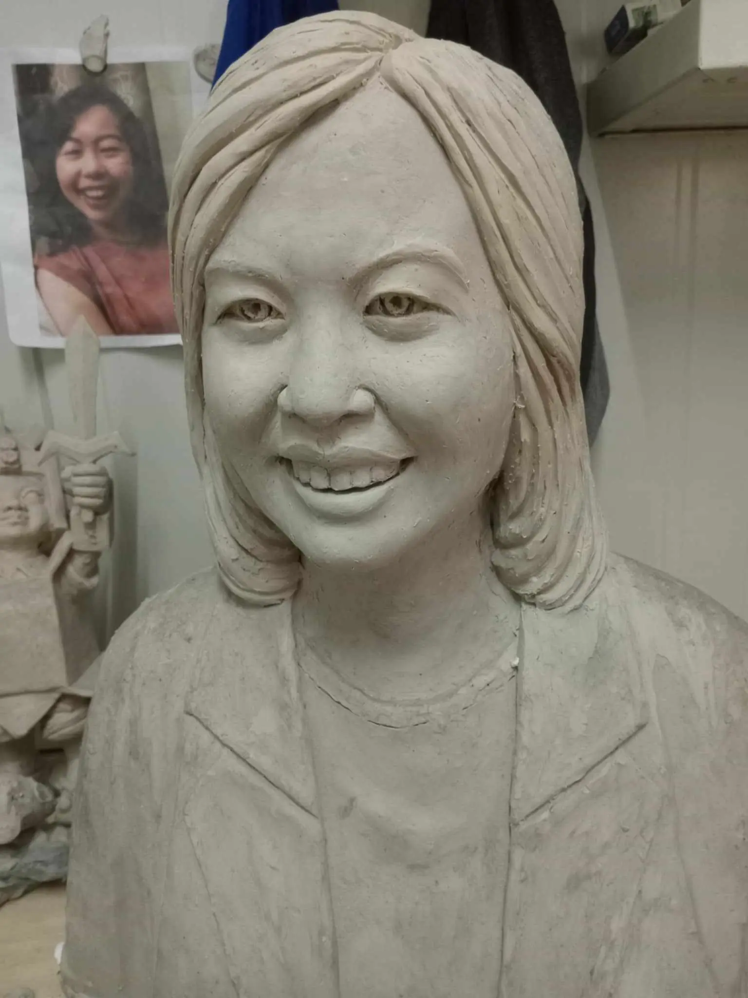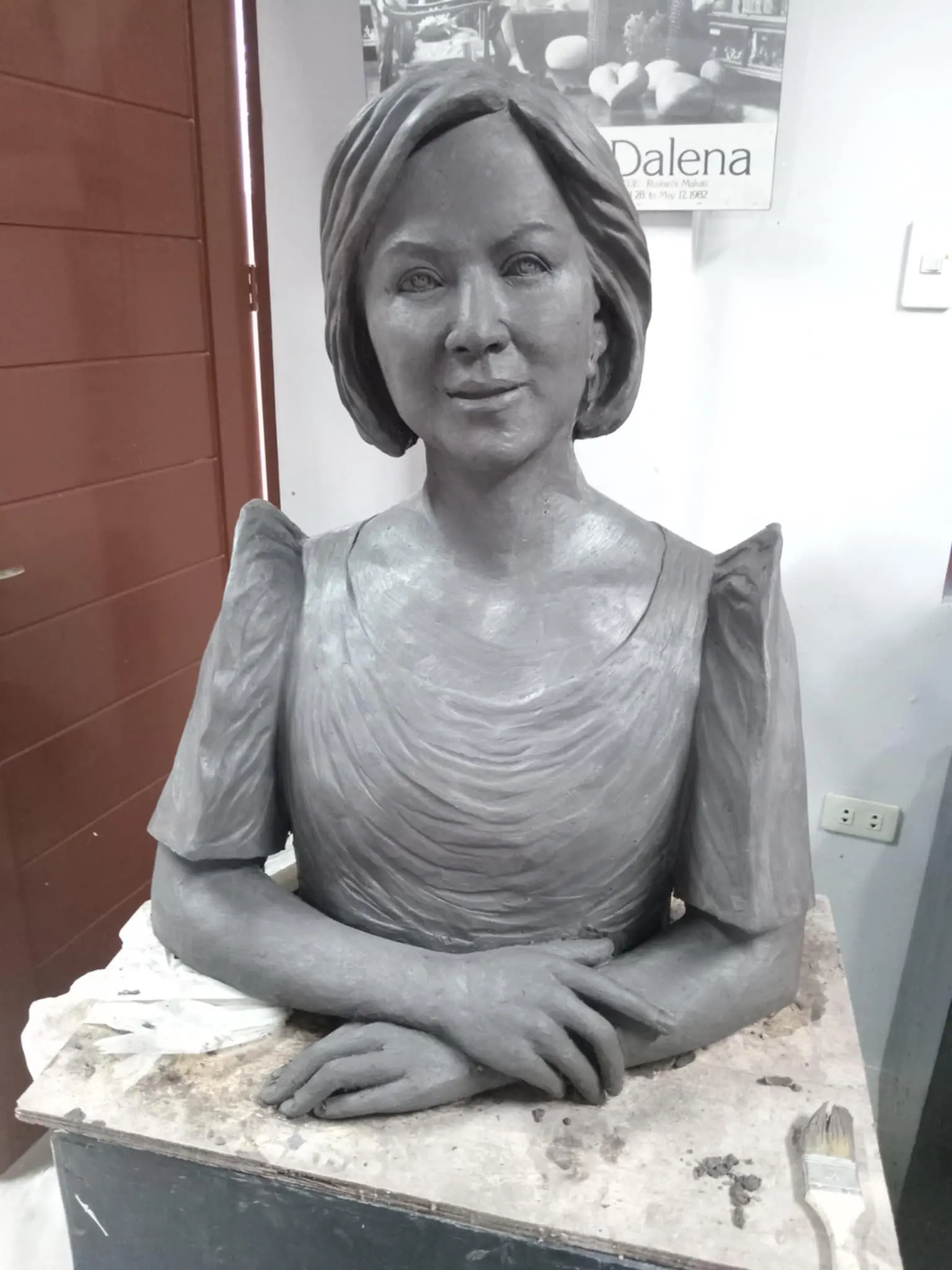 A clay bust of a woman with pleated dress, folded arms, and acrylic signage for a Quezon City client by M&G Global Ads.