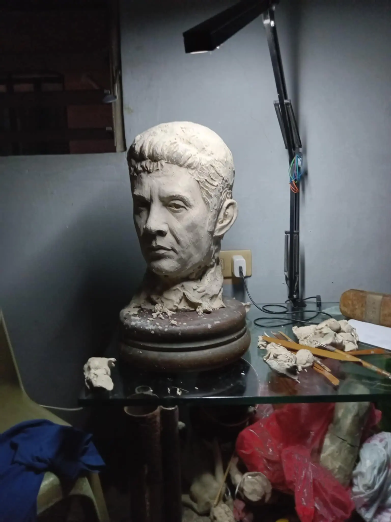 Clay bust and reference photo displayed in workshop with LED signage in Ortigas, creative space by M&G Global Ads.